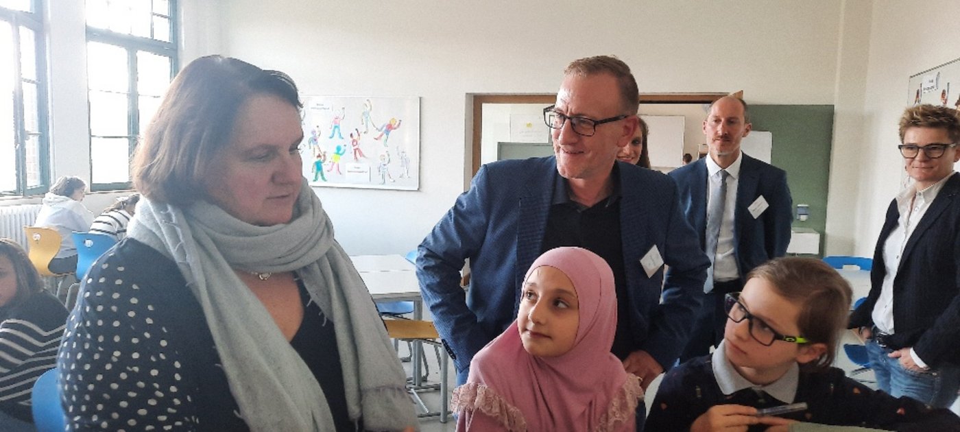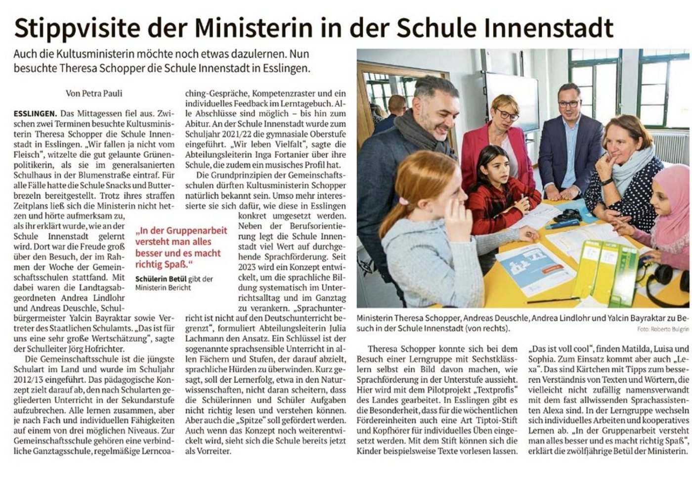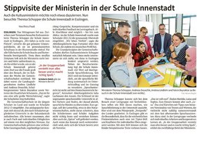 Im Rahmen der „Woche der Gemeinschaftsschulen“ besuchte Frau Kultusministerin Theresa Schopper die Schule Innenstadt Esslingen und machte sich ein Bild vom dortigen Lernen, Leben und der Schulgemeinschaft. Die Schülerinnen und Schüler begrüßten die Ministerin mit zwei musikalischen Darbietungen, bei denen die Besonderheit des Musikprofils der Schule zum Ausdruck gebracht wurde. Orchester und Unterstufenchor performten energiegeladen und mit Begeisterung den Schulsong der Schule und der Oberstufenchor bewies mit einem schwunghaften „Shackles“ wie wichtig das Abstreifen vorhandener Fesseln sein kann. Dass in dieser Schule den Schülerinnen und Schülern beim Ablegen von Fesseln, wie z.B. mangelnde Sprachkompetenzen aktiv geholfen wird, wurde anschließend bei einer Unterrichtshospitation im Sprachförderband mehr als deutlich. Voller Begeisterung nahm die Frau Ministerin zur Kenntnis, dass in der Schule Innenstadt bereits ein Sprachbildungskonzept erarbeitet, implementiert und in Umsetzung angelaufen ist. Solch eine Herausforderung gut bewerkstelligen zu können, setzt eine engagierte Lehrerschaft und einen Zusammenhalt der gesamten Schulgemeinschaft voraus. Dies konnte die Ministerin bei ihrem Besuch an dieser Gemeinschaftsschule spüren und erleben. (Fo)